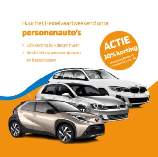 Onze verhuurauto's bestaan uit compacte wagens, zoals de Toyota Aygo, maar ook grote familie auto's waar 7, 8 of 9 personen in passen. Dankzij onze acties kun je met het hele gezin voordelig een dagje weg of op vakantie. Houd onze website in de gaten voor nieuwe acties!
